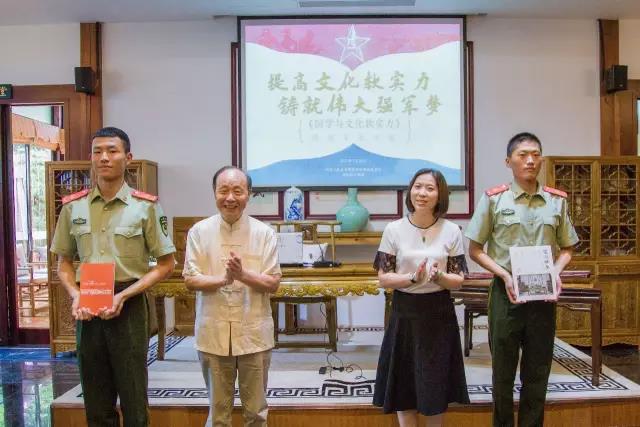 经心书院山长郭齐勇教授和理事长熊华敏女士向官兵们赠送文化书籍《中国儒学之精神》与《经心雅集》。