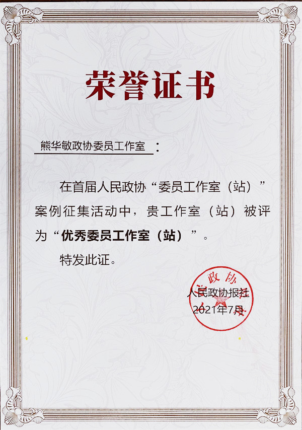 (图)熊华敏政协委员工作室荣誉证书